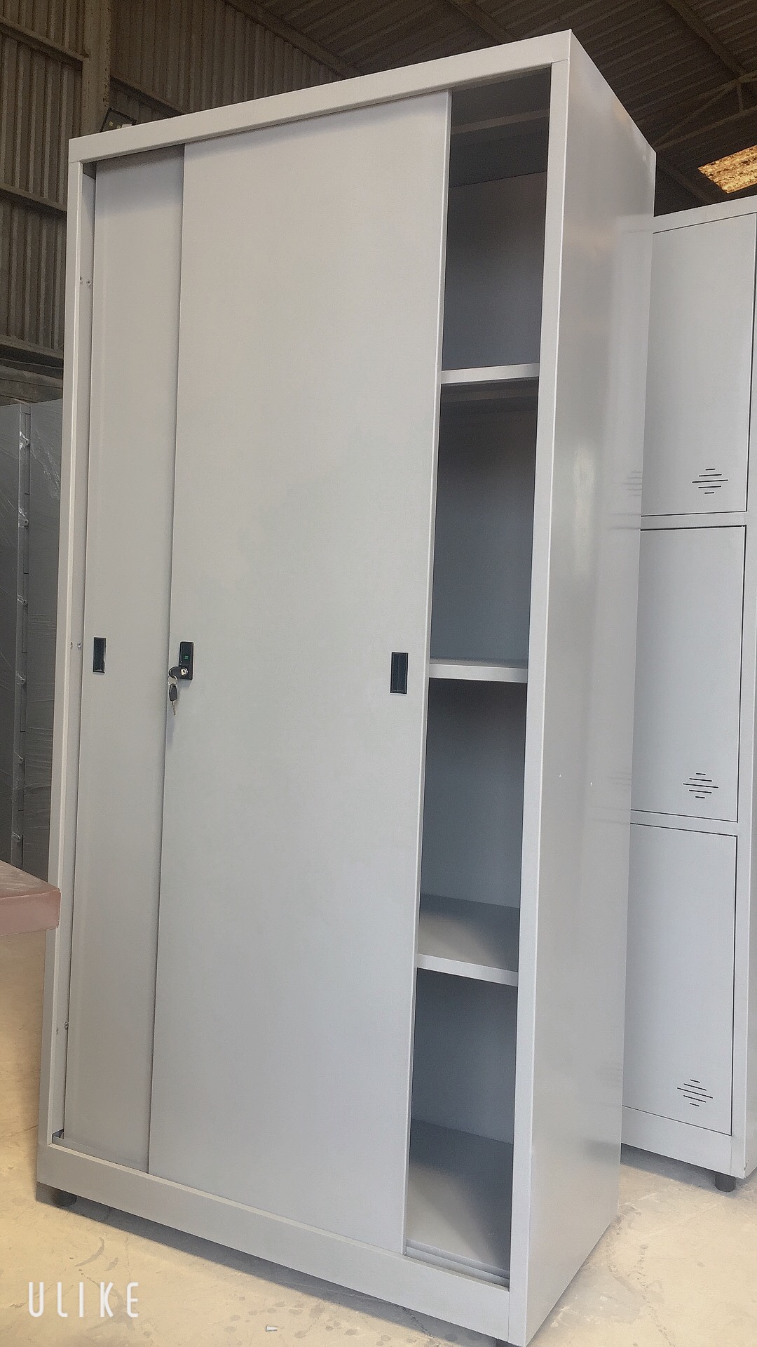 Mỗi khoang sắt chia làm 4 phần., 2 cánh sắt lùa có 1 đợt di động chia làm 4 ngăn để tài liệu, trên mỗi cánh có tay nắm âm và khóa locker.