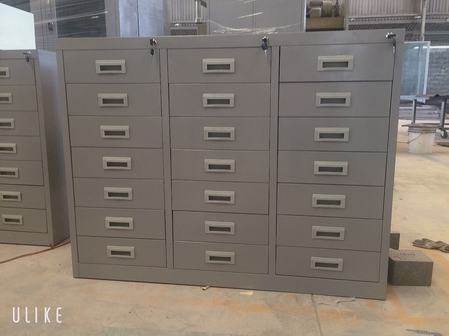 Tủ sắt sơn tĩnh điện 3 khoang, mỗi khoang có 4 ngăn kéo sử dụng chung 1 thanh khóa dàn.