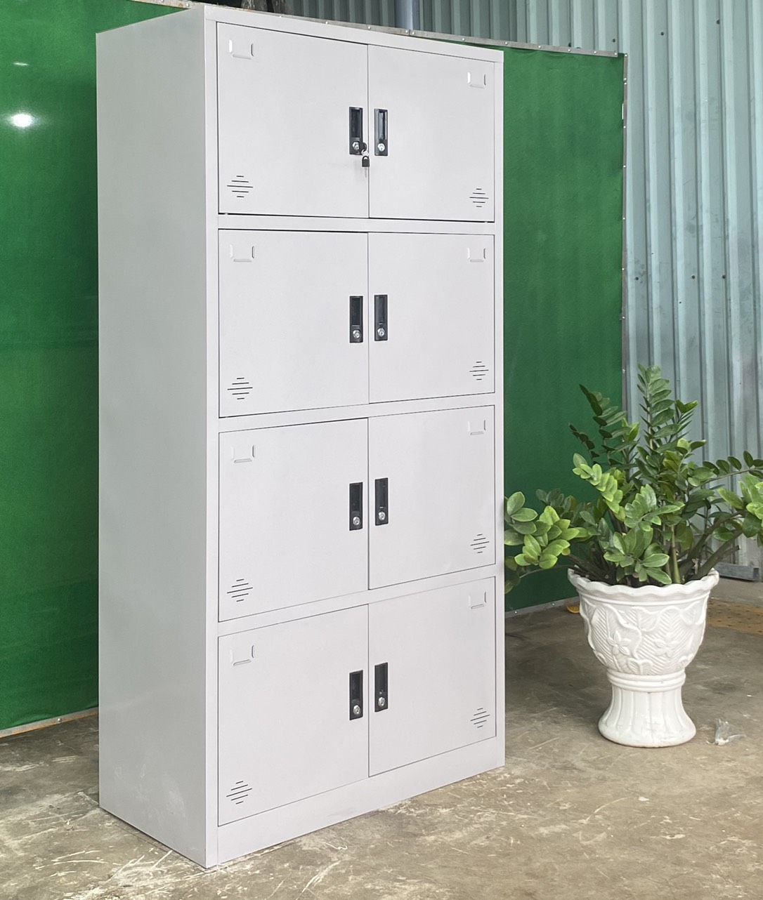 Tủ gồm 8 cánh sắt mở, mỗi cánh đều có 1 tay nắm nhựa liền khóa.