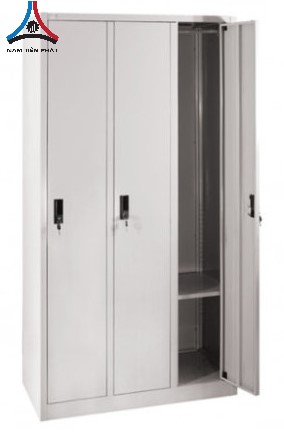 Tủ hồ sơ 3 buồng cánh sắt với kết cấu nguyên khối gồm 3 cánh sắt mở có 1 đợt cố định chia làm 2 ngăn, ngăn trên có bố trí cây treo quần áo, trên mỗi cánh có tay nắm âm và khóa locker riêng biệt.